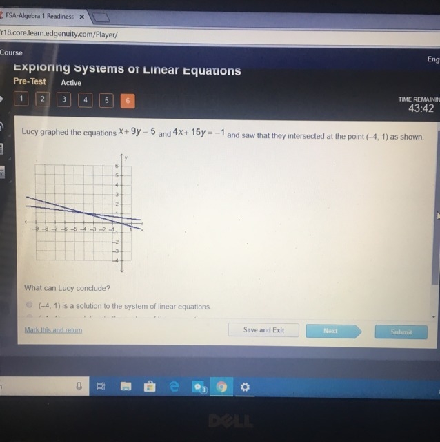 It is given that Lucy graphed the equation x+9y=5 and 4x+15y=-1 and saw that they intersected at the point (-4,1) as shown.