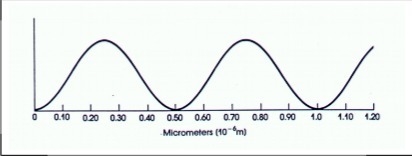 1. Given the distance scale in micrometers (1.0×10^-6m), shown in the figure, what is the wavelength in meters per wave?