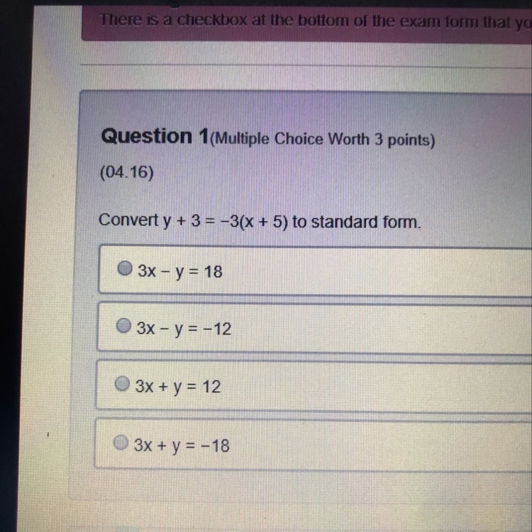 Convert y + 3 = -3(x + 5) to standard form.-example-1