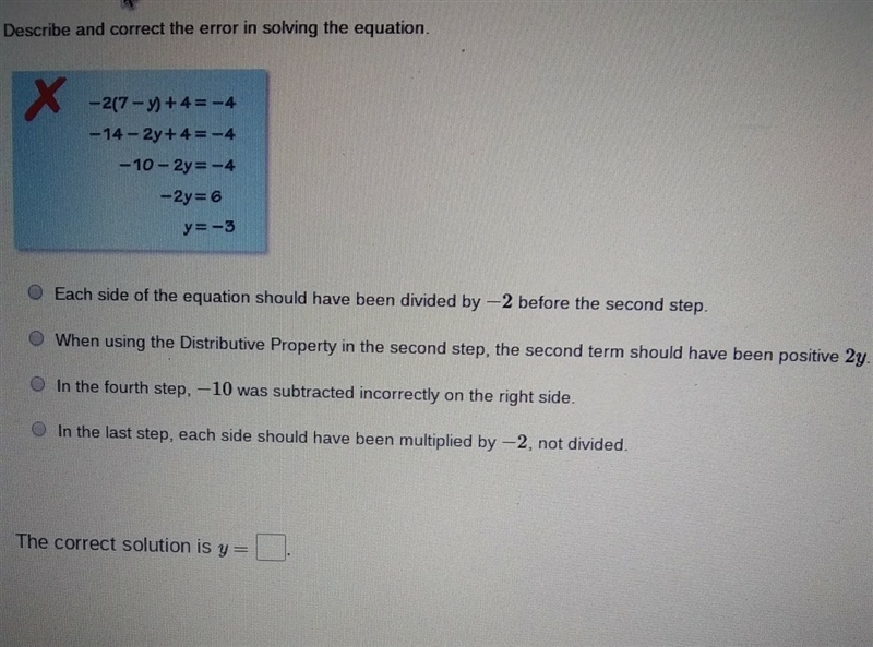 The correct answer is, when using the distributive property in the second step, the second term should have been positive 2y.