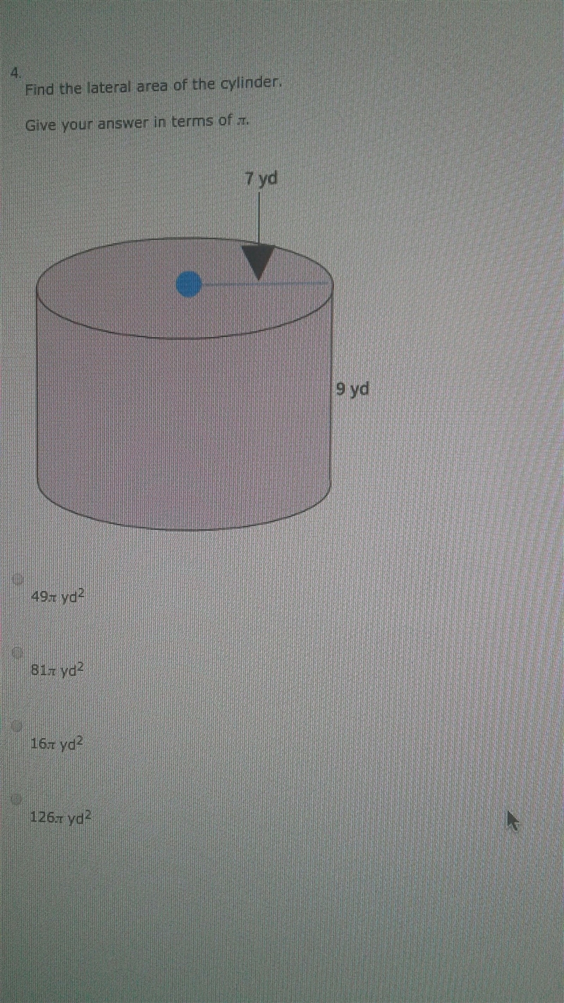 Find the lateral area of the cylinder. Give your answer in the terms of pi.-example-1