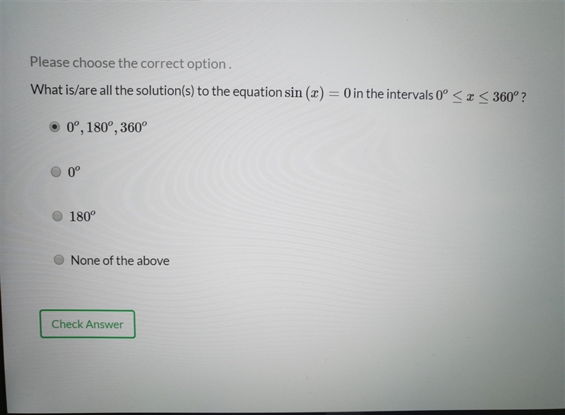 All the solutions to sin(x) is 0°,180°,360° as you've chosen