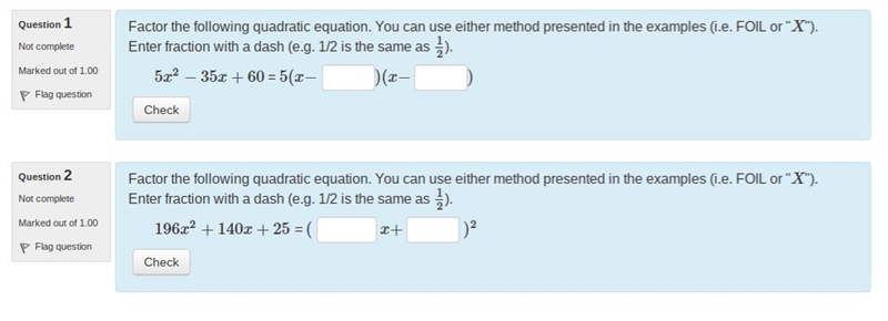 . The idea here now is to find 2 numbers that ADD up to -7 and MULTIPLY to positive 12. Those numbers are -3 and -4. Check the math. -4+(-3) = -7, and -4 * -3 = 12. So fill them into the parenthesis. 5(x-3)(x-4). That's question 1. For question 2, we have a perfect square binomial. That means that if we square the same (set of parenthesis) we will get back the original polynomial. 196, the leading coefficient in question 2 is a perfect square, with 14 being the square root. 25 is a perfect square with 5 being the square root. That means that (14x + 5)(14x + 5) will give us the original polynomial. FOIL it out to check it, but you'll be good.