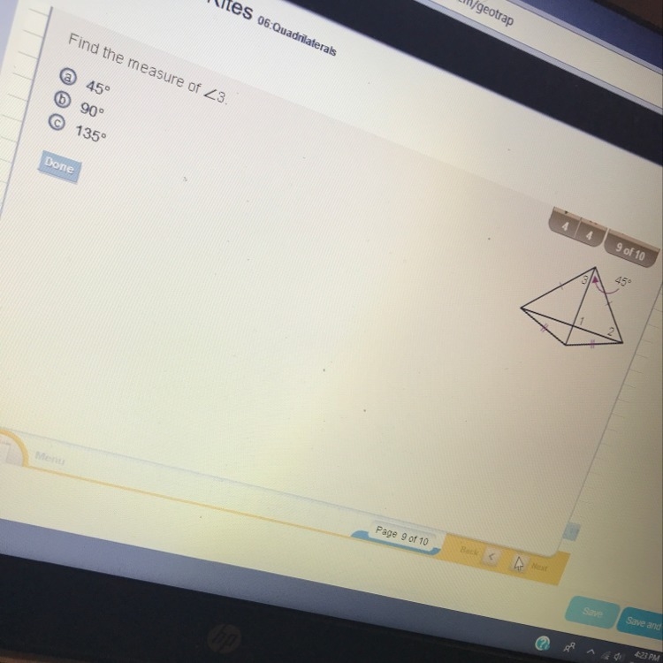 The angle adjacent to angle 3 = 45 The figure is a kite and the long diagonal cuts the top angle in 2 Therefore < 3 = 45 degrees.
