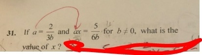 Since ax = 5/(6b) and a = 2/(3b), then we divide 5/(6b) by 2/(3b) to find what x equals.