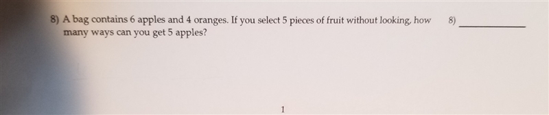1l A bad contains 6 apples and 4 oranges. If you select 5 pieces of fruit without looking, how many ways can you get 5 apples?