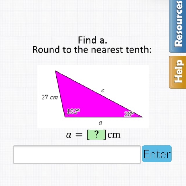 Here are the given values: sin C = 102 degrees, sin B = 28 degrees, b = 27 cm.