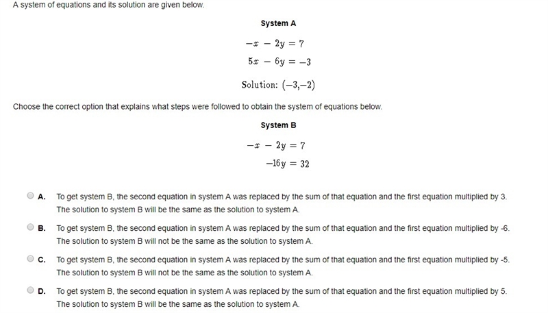 If we want to eliminate x we multiply the first equation by 5 then add it to the second: