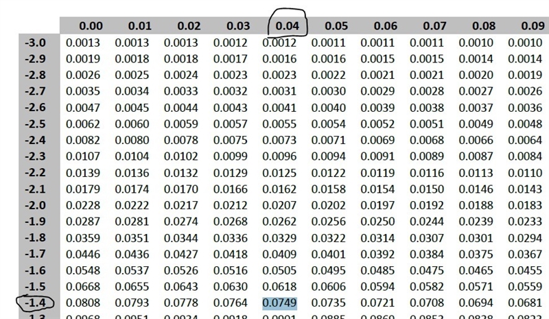 In z score table there is no accurate 0.075 probability value. The close value is 0.0749 which corresponds to z score -1.44