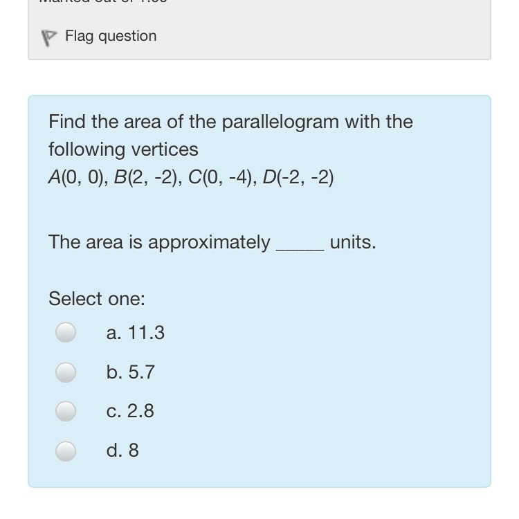 You should plot these. I won't but I can see it's a square. Each vertex differs from the previous one by two units in the x direction and two in the y. Each of the squared sides given by the Pythagorean Theorem is the area,