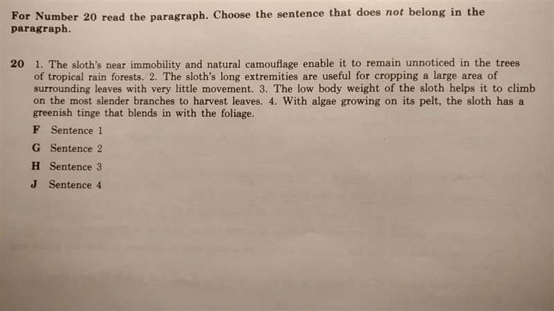 Sentence 4 does not belong to the paragraph! Why? Because algae do not grow on the sloth or near him. He lives in the trees were he sleeps 95% of the time and algae grows underwater! Sentence 4 has no logic at all!