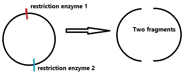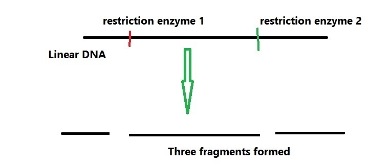 Explanation: The DNA molecule could be either linear or circular. Now according to the question, since each enzyme is cutting the DNA at one point only, the circular DNA would make two fragments only. It will look like this image shared below. And if its linear, then only it can make three fragments. The case of both linear and circular DNA is mentioned in images shared below.
