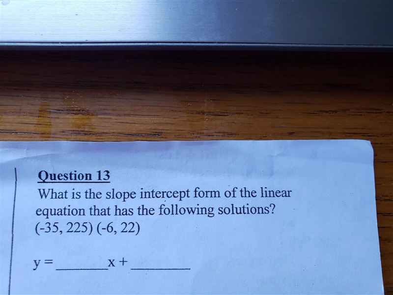 First, find the slope,m, y2-y1/x2-x1. Once you find the slope, find the y-intercept, b. To find b, plug in the slope and x and y. The slope intercept form is: y=-7x-20