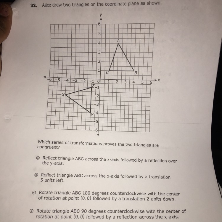 The answer would be A because if you reflect triangle ABC over the x-axis then the y-axis it will be congruent to triangle XYZ