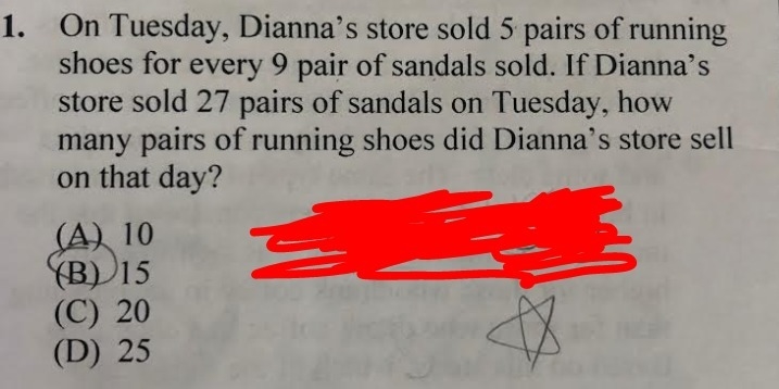 You're right on B. So if there are 27 pairs of sandals (starting with 9 pairs of sandals) you would divide 27 by 9 which is 3. Use 3 again and multiply it by 5 which is 15.