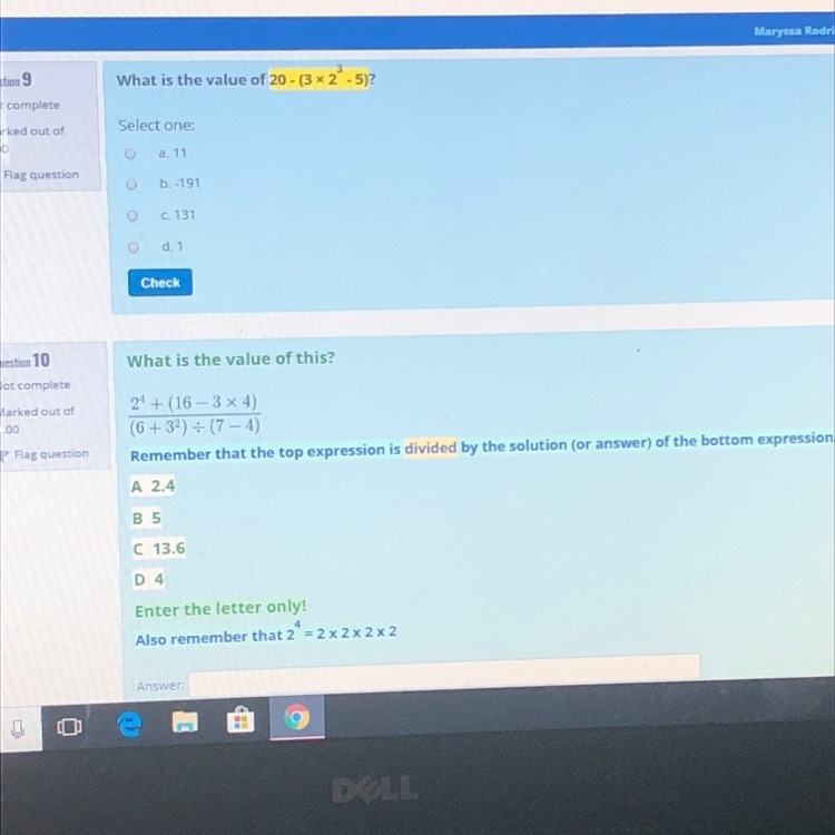 1 because using your order of operations you start parenthesis and inside that parenthesis is an exponent so you start with that. So 2^3 is 8. Now you have 20-(3x8-5). Now you do the multiplication in the parenthesis. So you get 20-(24-5). Finishing what is in the parenthesis you subtract 5 from 24 to get 20-19 or 1.