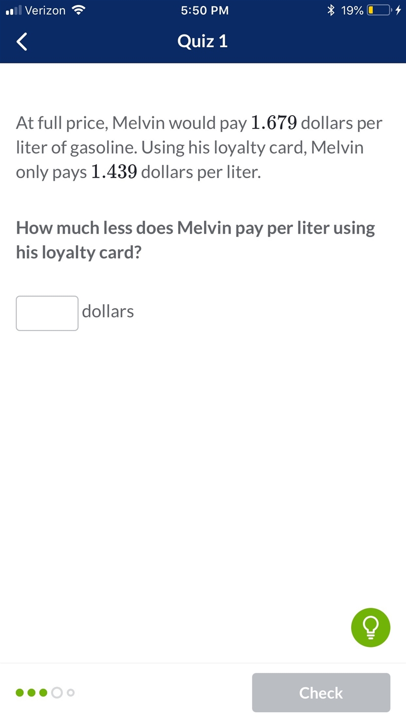 My work: This problem is easily achievable all you have to do is take your caculator and take price Melvin would pay with his loyalty card 1.679 and subtract it with 1.439. (1.679 - 1.439) When you do this you easily achieve your answer; Melvin pays 0.24 less per liter using his loyalty card.