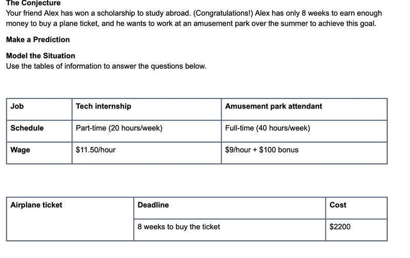 For each job an inequality that represents the number of hours Alex could work before the trip.