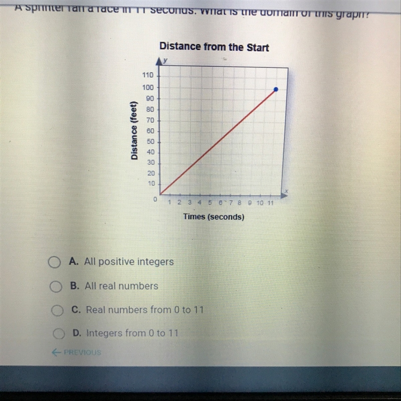 In this case since time is the x-axis, this means that he ran the race from 0 to 11 seconds, eliminating the first two options.