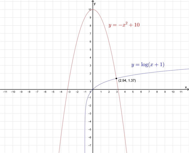 Graph the system. Use the graph to approximate the solution of the equation log(x + 1) = –x2 + 10