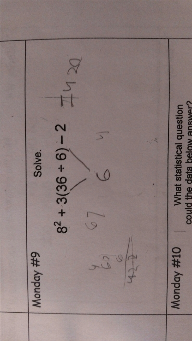 find 8^2 which is 64 and then multiply 3 times 36 (which is 108) and 6 (which is 18). Divide the 108 by 18 and you get 6. Then add 64 to 6 and then subtract it by two and you get 68.