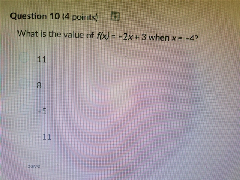 What is the value of f(x) = -2x + 3 when x = -4? Options are in the picture.