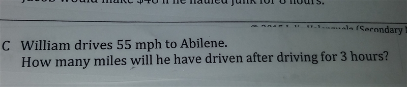 William drives 55 mph to abilene. How many miles will we have driven after driving for 3 hours