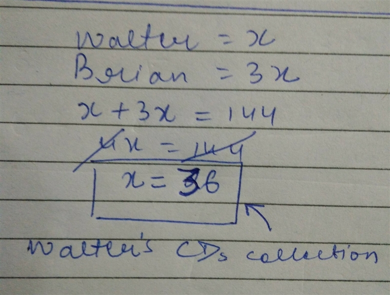 the number of cds in walters collection can be represented by x the number of cds in brian collection is 3 times the number in walter colletion the total number of cds in both collections is 144 what is