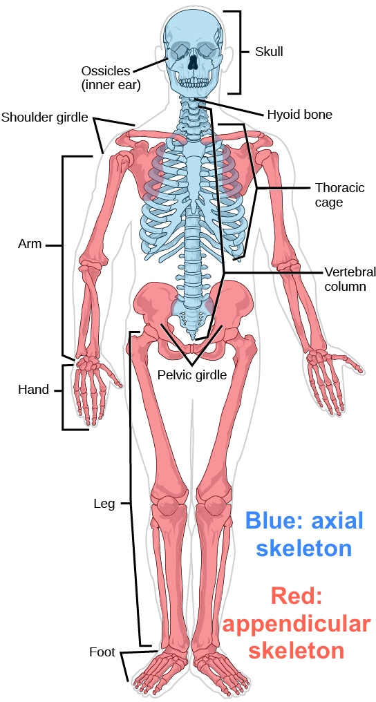 Axial skeleton: How many bones are there in the axial skeleton and what are its components? 1) 80 bones including the skull, vertebral column, thoracic cage, sternum, hyoid, and ears 2) 90 bones including