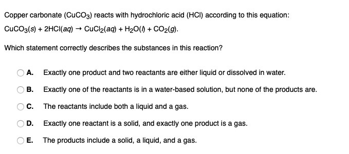 D: True. The statement is true because CuCO3 is labels as a solid(s), and CO2 is labeled as a gas (g).