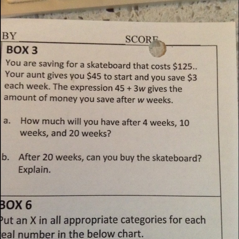 All you do is plug in the numbers 4, 10 & 20 for w to get that amount of money earned after that meant weeks.
