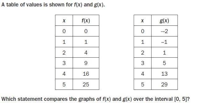 Answer is : c: The graph of f(x) exceeds the graph of g(x) over the interval [0, 4], the graphs intersect at a point between 4 and 5, and then the graph of g(x) exceeds the graph of f(x).
