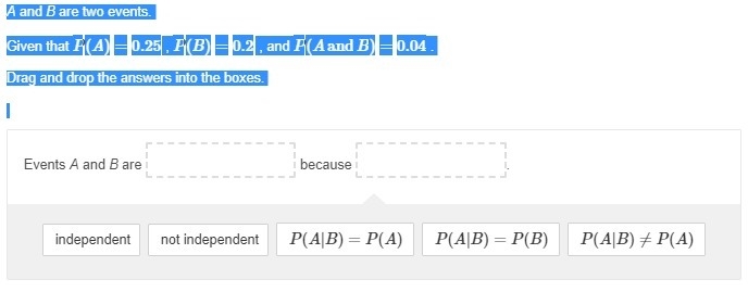 A and B are two events. Given that P(A)=0.25 , P(B)=0.2 , and P(A and B)=0.04 . Drag-example-1