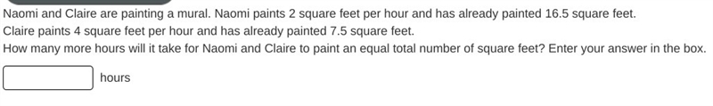 ok, so the changing aspect it the per hour. so for Naomi it would be 2x. she already has 16.5 . so her equation would be y=2x+16.5 . for Claire, the changing variable would be 4x. she already has 7.5 . her equation would be y=4x+7.5 . both equations are equal to the same variable, so you put them together to make 2x+16.5=4x+7.5 . first you would get rid of the x variables by subtacting the 2 on each side giving you 16.5=2x+7.5 . subract the 7.5 on each side and then divide by 2. then you will get your answer.