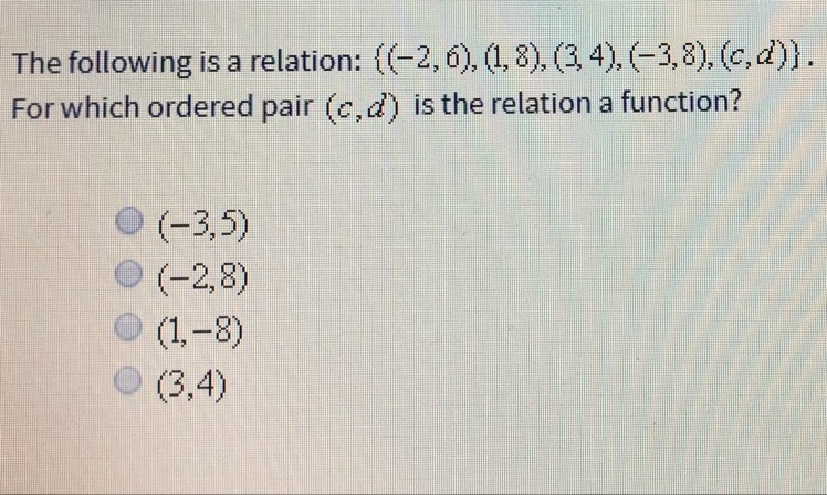 R={(-2,6), (1,8) , (3,4), (-3,8) , (c,d)}