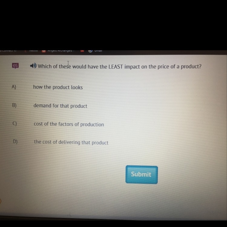 Answer: A. How the product looks would have the least impact on the price of a product.
