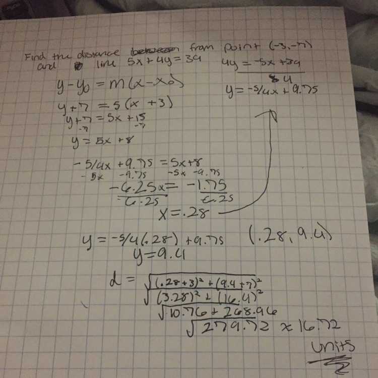 I know it's messy but can someone let me know if this was right? It's asking for the distance from point (-3,-7) to line 5x+4y=39