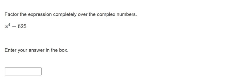 PLEASE HELP ASAP!!! CORRECT ANSWERS ONLY PLEASE!!! I CANNOT RETAKE THIS!! Factor the expression completely over the complex numbers. x^4 − 625