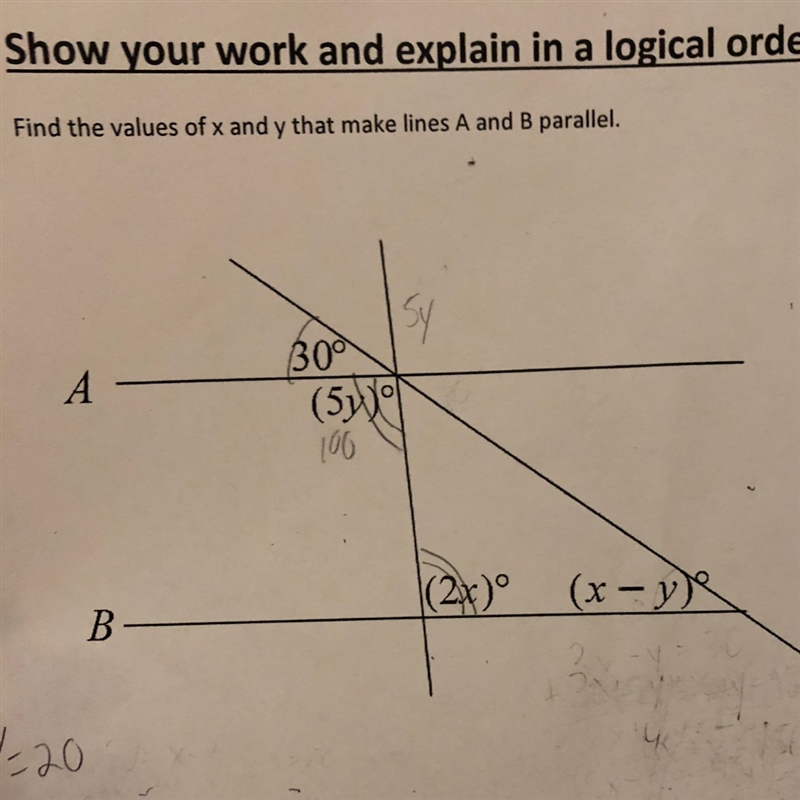given that A and B are parallel, you can conclude that 30 = x - y since they are corresponding angles. Also you can conclude that 5y = 2x since they are alternate interior angles. At this point, there is a solvable system of equations set up