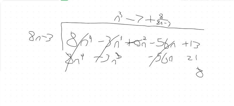 After applying algebraic long division, which is included in the screenshot below, the quotient is equal to n(n^3 - 7 + (8/8n - 3))