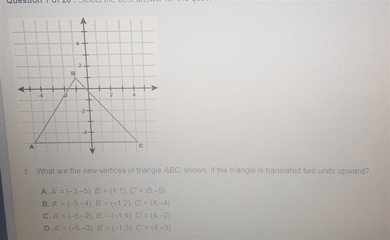 The answer would be D, because the original cooridinates are A(-5,-5), B(-1,1), C(4,-5). Solving the problem, you'd add 2 to each of the y values. A'(-5,-5+2), B'(-1,1+2), C'(4,-5+2). So, your final answer would be A'(-5,-3), B'(-1,3), C'(4,-3)