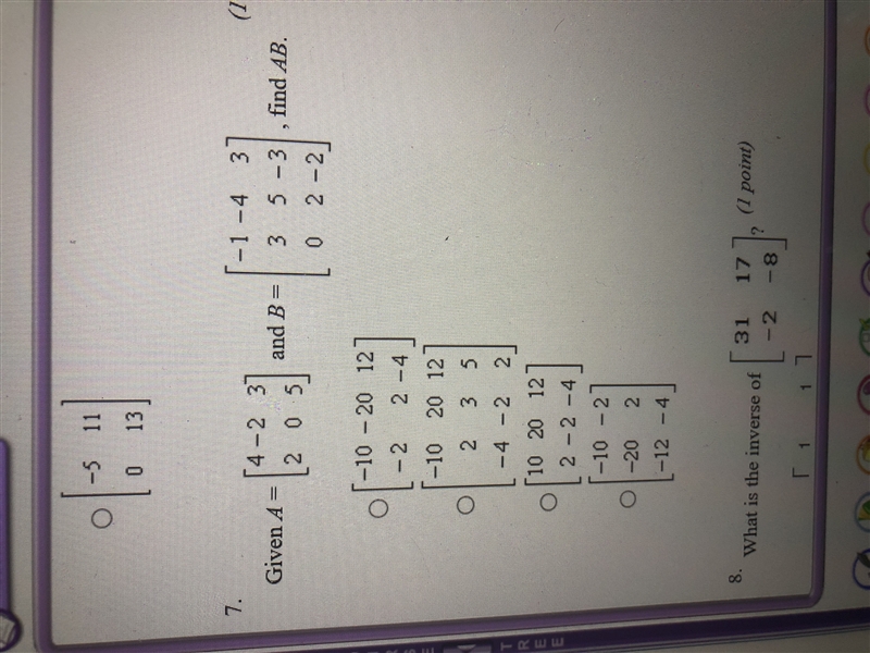 ![\bf AB\implies \begin{bmatrix} 4&-2&3\\2&0&5 \end{bmatrix}\cdot \begin{bmatrix} -1&-4&3\\3&5&-3\\0&2&-2 \end{bmatrix} \\\\[-0.35em] ~\dotfill\\\\ \begin{array}{lrlll} (4)(-1)+(-2)(3)+(3)(0)&=-10\\\\ (4)(-4)+(-2)(5)+(3)(2)&=-20\\\\ (4)(3)+(-2)(-3)+(3)(-2)&=12 \end{array}\impliedby \textit{the first row of the product} \\\\[-0.35em] \rule{34em}{0.25pt}](https://img.qammunity.org/2019/formulas/mathematics/middle-school/tdsovmrl9lvk1a79qmn8mkc4pxmwcydnj8.png)