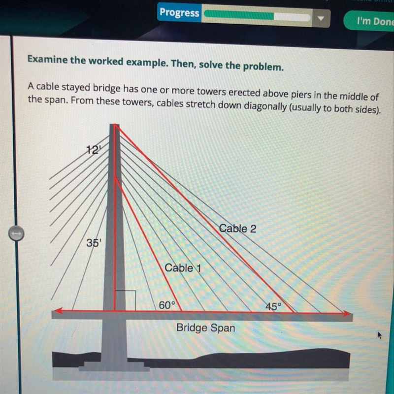 try to think about which trig functions to use to find the answers for cable 2. if you need more help leave a message.