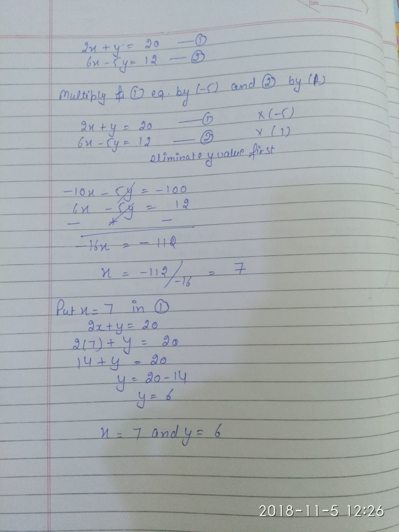 What is the solution of the system? Use the elimination method. 2x+y=206x−5y=12 . Enter your answer in the boxes.