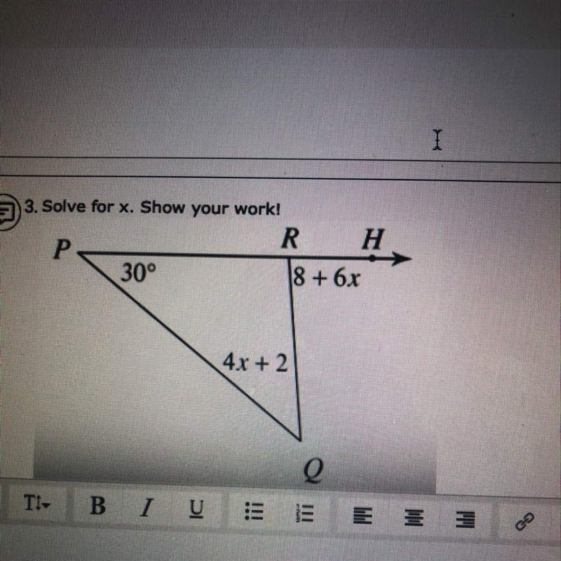 30 + 4x + 2 + 180 - (8 + 6x) = 180;The sum of all angles in a triangle is 180