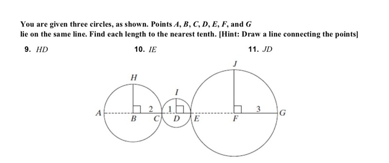 The radius of a circle is the same from the center to every point on the circle. This tells you HB = BC = 2; CD = DE = 1; EF = JF = 3.