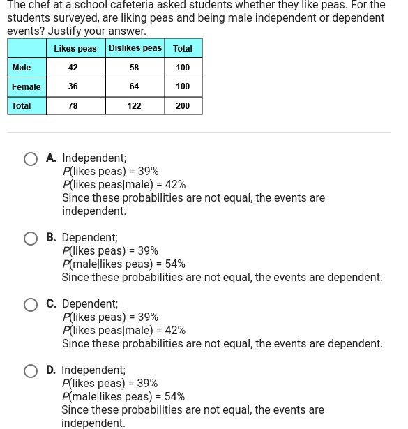 Selections B and C are both "Dependent," so are correct in that aspect. However, the "reason" given for B has a bogus number (54%) for males liking peas. We have no idea where that number came from. C has the correct reason, so is the appropriate selection.