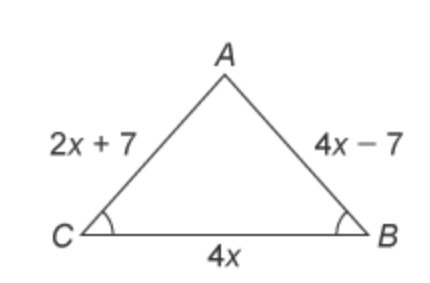 The triangle is isosceles, because (from the diagram) ∠ A B C = ∠ A C B - note how the angle there is marked on both of these. If these angles are equal, this means that the sides
