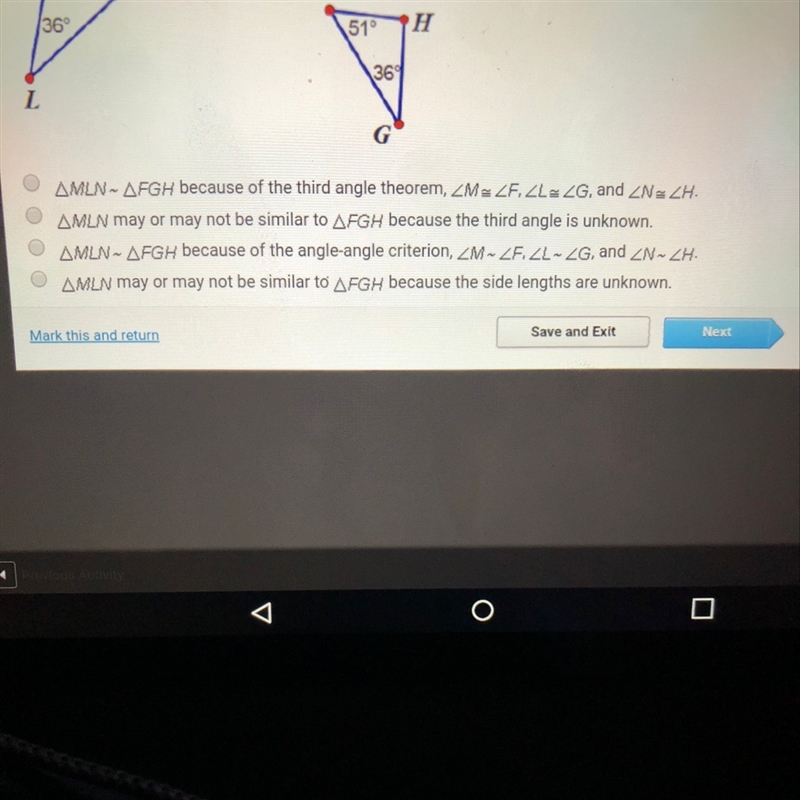 Which best describes the relationship between the two triangles in the picture? Choice answers in picture help pleasssssseeeee HURRRRYYY