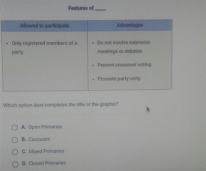 Closed Primaries. In a closed primary, only voters registered with a given party can vote in that party's primary. States with closed primaries include party affiliation in voter registration so that the state has an official record of what party each voter is registered as.
